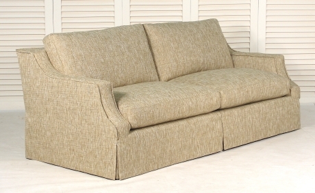 Shown with optional Skirt From Deck and flange detailing on frame. Loose seat and back cushions - boxed with topstitching. The cushion fill is 50/50 Down/Feathers with a foam core in the seats. Skirt from deck is hemmed to 1/4" from floor. Custom modifications available.