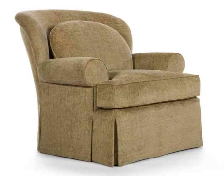 Crescent tight back with shaped lumbar pillow. Loose seat cushion, boxed with welt. The fill is 50/50 Down/Feathers with a foam core in the seat. Frame is detailed with self welt. Skirt from deck is hemmed to 1/4" from floor. Custom modifications available.