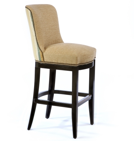 Tight button pleated back. Tight boxed seat with topstitching. Nail head detailing on frame. Mahogany legs and stretchers finished in a standard stain. Antique brass rail cap at front. Bar and Counter height available. Custom modifications available.