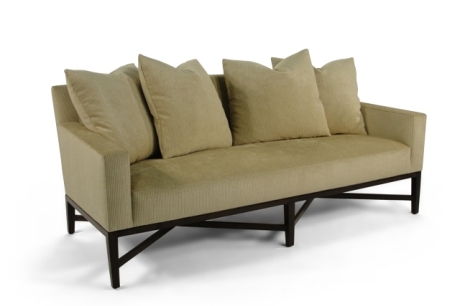 Tight seat boxed with topstitching. Throw pillow back, knife edge. The fill is 50/50 Down/Feathers. Topstitch detailing on frame. Mahogany legs and stretchers. Custom modifications available.