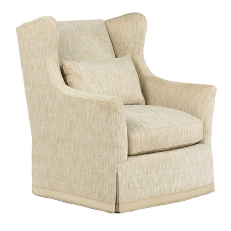Tight wing back with kidney pillow. Loose seat cushion, boxed with welt. Cushion fill is 50/50 Down/Feathers with a foam core seat. Frame is detailed with welt. Skirt from deck is hemmed to 1/4" from the floor. Shown with optional Cuff Detail at hem. Custom modifications available.
