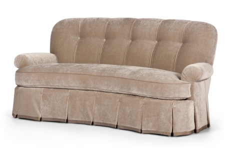 Tight crescent back buttoned and pleated. Single loose seat cushion, boxed with welt. The fill is 50/50 Down/Feathers with a foam core. Skirt from deck box pleated all around is hemmed to 1/4" from floor. Shown with optional Cuff Detail at hem. Custom modifications available.