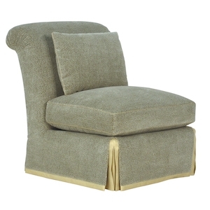 Tight rolled back with kidney pillow. Loose seat cushion, boxed with welt. The fill is 50/50 Down/Feathers with foam core. Skirt from deck with double pleats at front corners is hemmed to 1/4" from the floor. Shown with optional Cuff Detail at hem and contrast pleats. Custom modifications available.