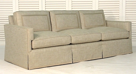 Loose seat and back cushions, boxed with contrast welt. Back cushions with applique detail in contrast fabricd. The fill is 50/50 Down/Feathers with a foam core in seats. Frame is detailed with contrast welt. Dressmaker skirt from deck with Cuff detail at hem in contrast fabric.