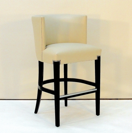 Curved back with boxed and topsitiched seat. Mahogany legs and stretchers finished in a standard stain. Nailhead detailing at the top of front legs. Customizations available.
