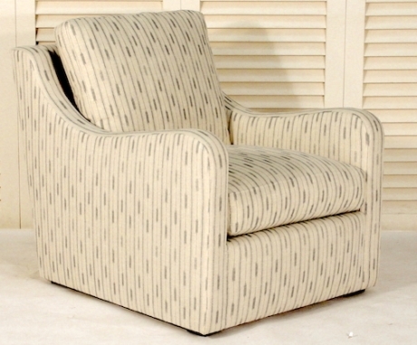 Loose back and seat cushions, boxed with topstitching. Fill is 50/50 Down/Feathers with a foam core seat. Topstitch detaiing on frame. Upholstered base.