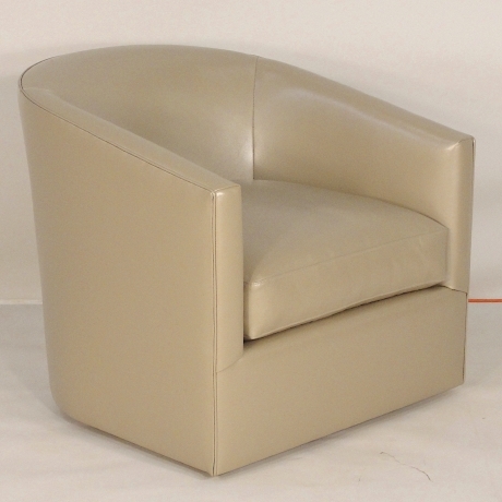 Tight barrel back. Loose seat cushion, boxed with topstitching. Cushion fill is 50/50 Down/Feathers with a foam core. Upholstered base to floor.