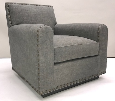 Tight back. Loose seat cushion, boxed with topstitching. Cushion fill is 50/50 Down/Feathers with a foam core. Waterfall style arms. Large antique brass nail head detailing on frame. Mahogany plinth base finished in a standard stain.