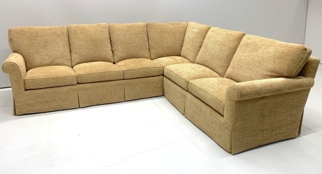 Available custom in any configuration. Loose seat and back cushions, boxed with welt. Fill is 50/50 Down/Feathers with foam core seats. Dressmaker skirt from deck is hemmed to 1/4" from floor.