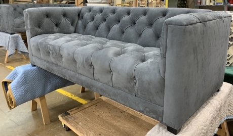 Tufted back, seat and arms. Mahogany wedge feet finished in a standard stain. Customizations available.