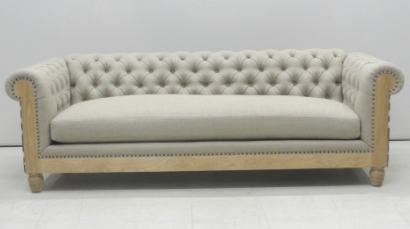 Chesterfield sofa with loose seat cushion. Cushion fill is 50/50 Down/Feathers with foam core. Exposed wood panels at front and turned legs are in unfinished oak. Nail head detailing.