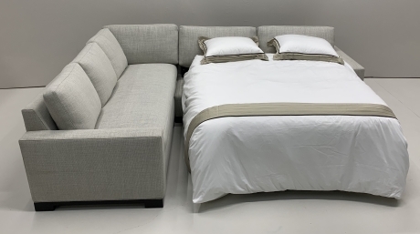 Available in any configuration. Queen size Hide-A-Bed with Air Dream Mattress. Loose seat and back cushions, boxed with topstitching. Fill is 50/50 Down/Feathers with foam core seats. Mahogany base finished in a standard stain.