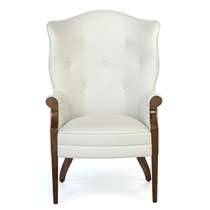Tight shaped wing back with button detailing. Tight boxed seat. Mahogany panel arms and tapered legs finished in a standard stain.