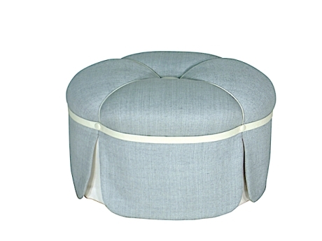 Custom scalloped shape. Tight channeled seat with button center. Scalloped skirt is outlined with contrast welt. Contrast band at top of skirt with buttons and contrast inset pleats. Custom modifications available.