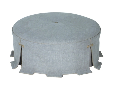 Custom dimensions. Standard details include tight mitered seat. Handsewn skirt is outlined with cord trim and drapes on to floor. Optional detailing shown are trim Scrolls at the pleats and a trim Snail at the center top. Custom modifications available.