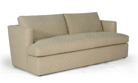 Single loose seat cushion, boxed with topstitching. Loose back cushions, boxed with topstitching. The fill is 50/50 Down/Feathers with a foam core in the seat cushion. Shown with optional upholstered base to floor. Custom modifications available
