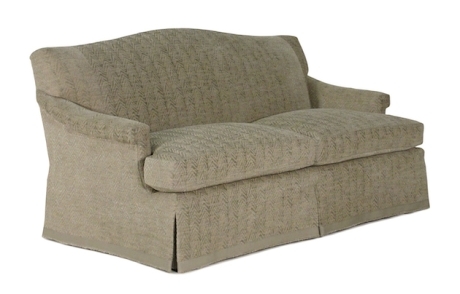 Tight camel back. Single loose seat cushion - boxed with welt. The fill is 50/50 Down/Feathers with a foam core. Welt detailing on frame. Skirt from deck is hemmed to 1/4" from floor. Shown with optional trim applied at hem. Customization available.