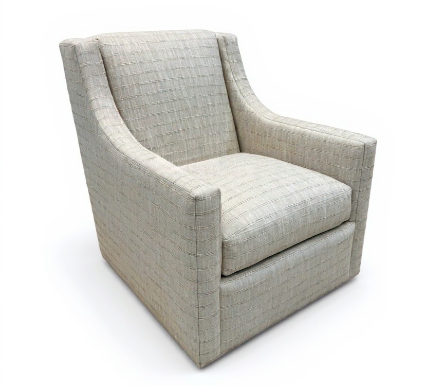 Tight down padded back. Loose seat cushion, boxe with topstitching. The fill is 50/50 Down/Feathers with a foam core seat. Upholstered base to floor. Custom specifications available.