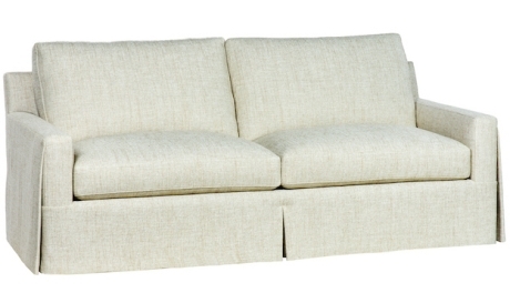 Loose seat and back cushions, boxed with topstitching. The cushion fill is 50/50 Down/Feathers with foam core seats. Topstitch detailing on frame. Dressmaker skirt from deck with Open Pleats at front corners. Skirt is hemmed to 1/4" from floor. Custom modifications available.