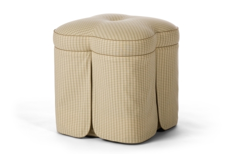 Clover shaped tight boxed seat mitered with pull stitch center. Frame detailed with self welt. Scalloped skirt is outlined with welt and buttons at pleats. Locking casters are standard. Custom modifications available.