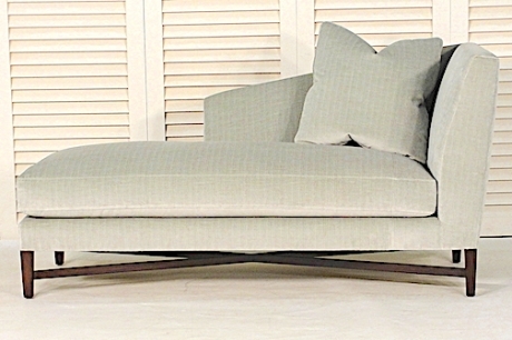 Tight back with throw pillow. Loose seat cushion, boxed with topstitching. Fill is 50/50 Down/Feathers with a foam core in seat. Mahogany stretchers and tapered legs finished in a standard stain.