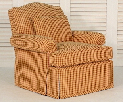Tight banded back with kidney pillow. Loose seat cushion, boxed with welt. Dressmaker skirt from deck is hemmed to 1/4" from floor.