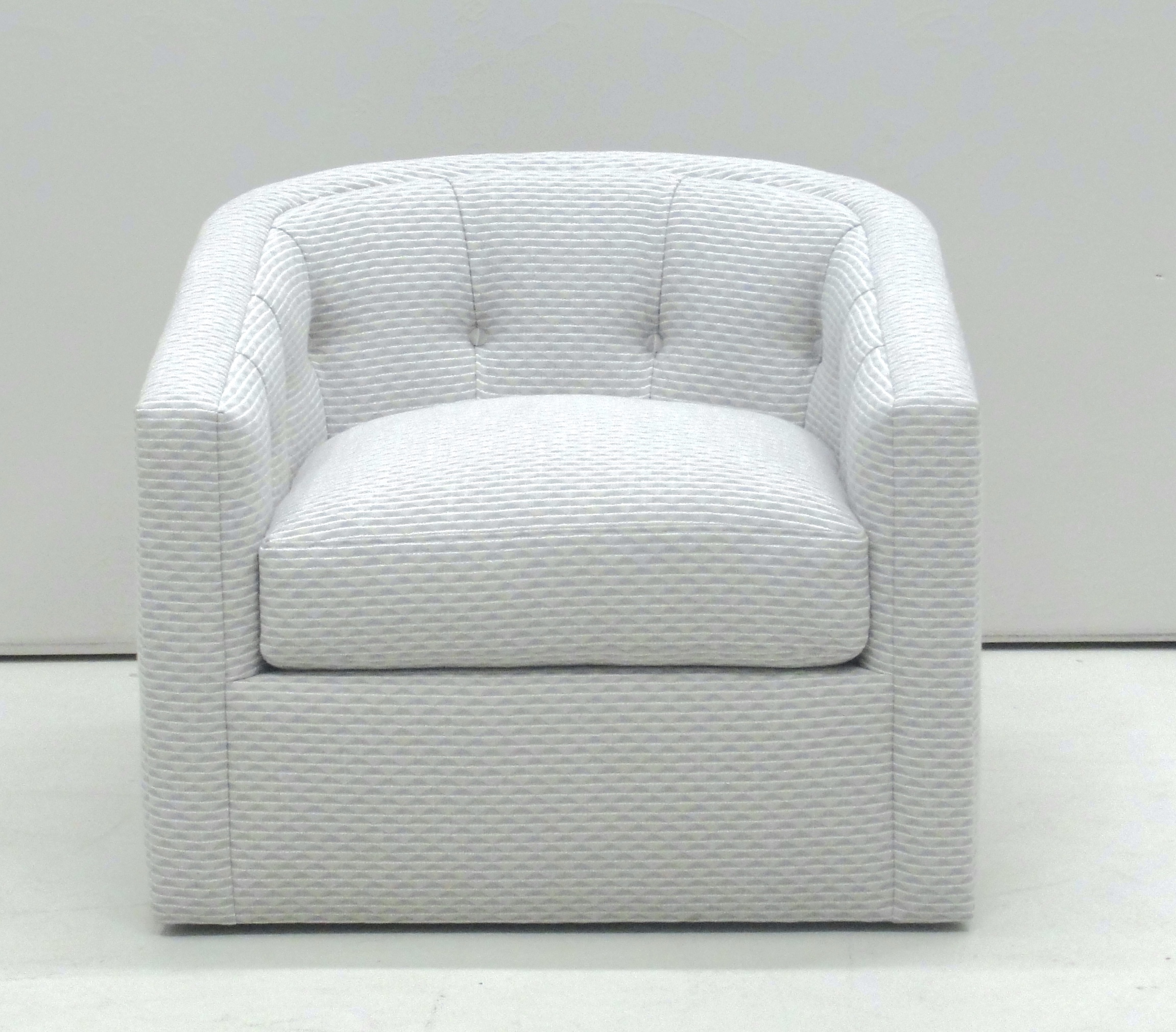 Barrel back with button pleat detail. Loose seat cushion, boxed with topstitching. Fill is 50/50 Down/Feathers with foam core. Upholstered to floor with swivel base.