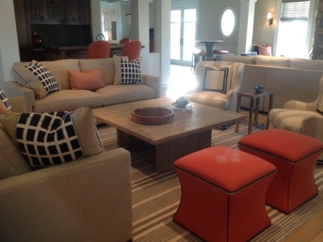 Shown are a pair of Austin sofas with custom accessory throw pillows. And a pair of Barrett lounge chairs with appliqued trim on back pillows and at skirt hem. In the background are a set of Holmes swivel bar stools and Edward (backless) barstools. A pair of English sofas face the fireplace.