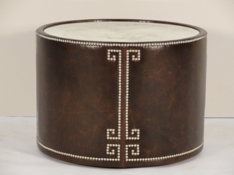 Custom dimensions shown. Fully upholstered with decorative Greek Key style nail head detailing. Shown with optional Antique Mirror Glass inset top. Concealed casters are standard. Custom modifications available.