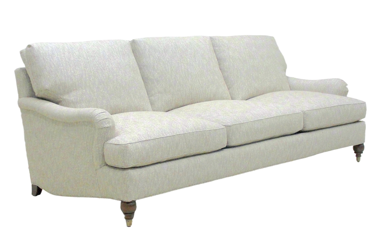 Loose seat and back cushions. The cushion fill is 50/50 Down/Feathers with a foam core. Mahogany turned legs at front with sabots. Finished in a standard stain. Custom modifications available.