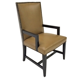 Tight seat and back. Nail head detailing at seat and inside back. Mahogany arms, legs and stretchers finished in a standard stain.