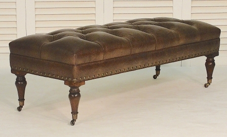Tufted seat. Banded sides with nail head detailing at base. Mahogany turned legs finished in a standard stain. Antique brass wheels.